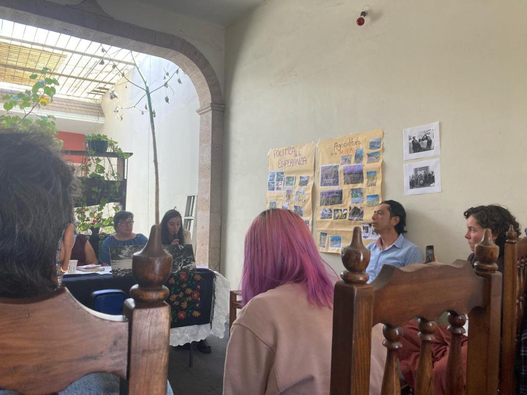 María González resaltó la importancia de transmitir el conocimiento a los jóvenes para que consigan, como en su caso, la autonomía de sembrar y cuidar: “ya no tenemos patrones”. Añadió ejemplos específicos de actividades que esperan realizar con los próximos alumnos de la Universidad de Mexcala, como el cuidado de los animales, de los árboles y reforestación o mantenimiento para la laguna de Chapala. Eliodoro Martínez reiteró la importancia de compartir los conocimientos y de ser “un sólo cuerpo” que contribuya a su comunidad. Hugo Sánchez habló del reto de las generaciones antiguas para intentar que lxs jóvenes resistan a las formas de occidente y consigan este arraigo con la comunidad, por la destrucción de la mayor parte del planeta.